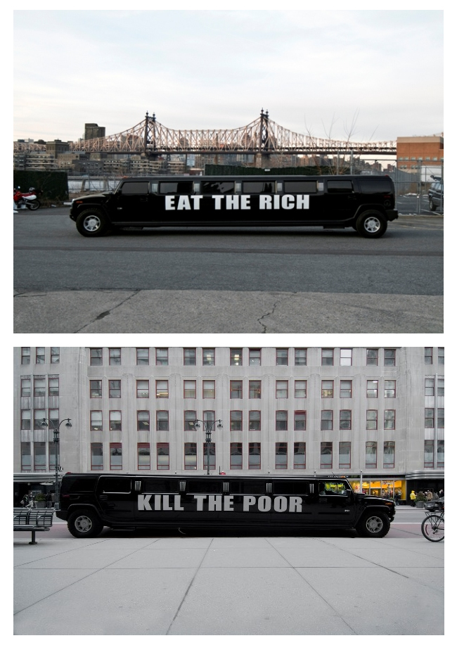 El proyecto EAT THE RICH / KILL THE POOR es una intervención sobre una limusina que transportaba coleccionistas y amantes del arte durante el Armory Show 2010 en New York.