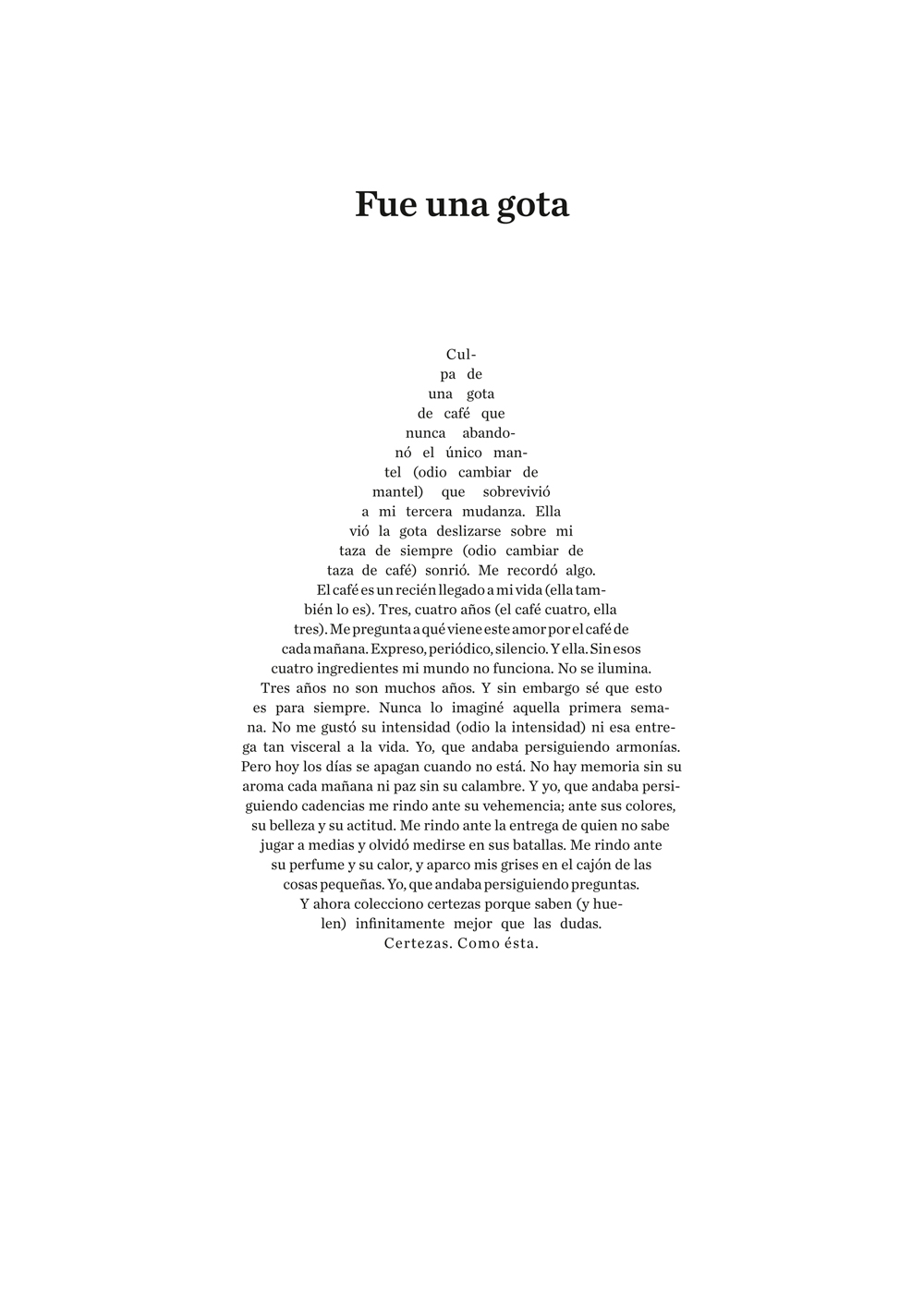 Un libro que dice tratar «de recuperar cosas buenas que no deben perderse”, en los tiempos del amor-meetic y del amor rápido y todo a golpe de (fastidiosos) eslóganes: “la persona a la que amas no es con la que te acuestas, es con la que tomas el café por la mañana”.