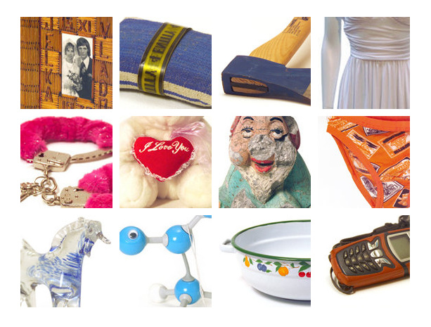 Unas esposas forradas de peluche rosa, un vestido de novia, ropa interior, un viejo teléfono móvil, una radio o una cafetera, son algunos objetos que pueden encontrarse en sus vitrinas.