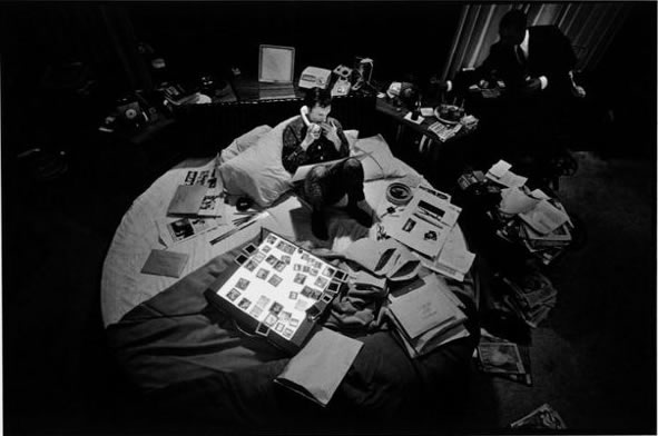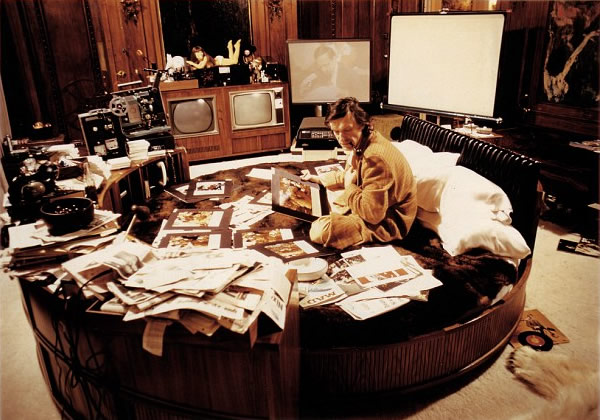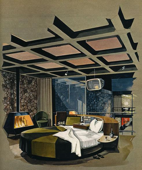 «En medio de la interminable y reversible transformación de lo privado en público que caracterizaba el funcionamiento de la Mansión, la cama giratoria de Hefner era el dispositivo farmacopornográfico por excelencia. Dejando atrás su condición de mueble, la cama Playboy aspiraba a convertirse en hábitat, prótesis y centro de producción audiovisual. Con un diámetro de 2,6 metros, la cama de Hefner estaba dotada de un motor hidráulico interno que le permitía girar 360 grados en cualquier dirección y vibrar (bruscamente) cuando estaba detenida. La plataforma giratoria reposaba sobre el panel fijo en el que se habían acoplado, como si se tratara de una cabina aeroespacial, un máximo de conexiones multimedia. El respaldo de cuero servía a la vez de punto de apoyo y panel de control con el que maniobrar una radio, un aparato de televisión, un proyector de películas y un teléfono que permitía conectar tanto con el exterior como con la línea interna de la Mansión y de las oficinas Playboy. Gracias a una cámara de vídeo instalada en un trípode y dirigida hacia el área de la cama, Hefner podía filmar sus encuentros «privados», tanto si eran de negocios como sexuales, una distinción que la cama y sus múltiples dispositivos técnicos de vigilancia y grabación deshacían con un ritmo equiparable al de su vibración. De este modo, al registro textual de encuentros sexuales que Hefner había comenzado en 1952, anotando detalladamente el quién, cómo, cuándo, así como las «posiciones» y «especialidades» con códigos que le permitían una posterior clasificación, se sumaba ahora un permanente registro audiovisual que arrojaba cientos de horas de grabación. La cama giratoria se había convertido en la plataforma de producción de un archivo multimedia de la vida sexual de su ocupante. Todos los materiales audiovisuales grabados tanto en la habitación de Hefner como en el resto de las habitaciones dotadas con sistema de vigilancia interna podían ser después visionados y editados por el propio Hefner en una sala de control audiovisual.» (Pornotopía, Beatriz Preciado).