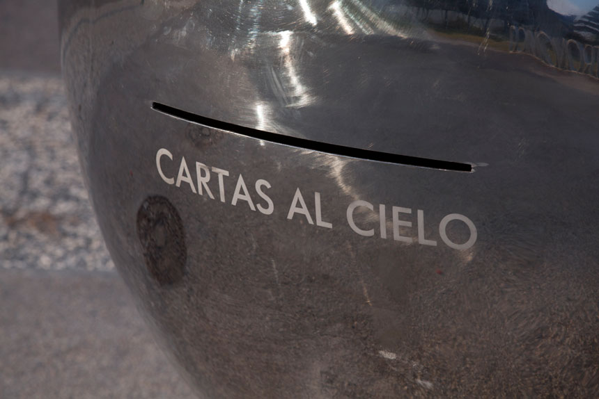«Mirar hacia el cielo es un acto reflejo, un momento lleno de esperanza, deseo o desesperación. El cielo es el lugar que mantiene nuestros secretos, nuestros seres queridos y el más allá. Para formalizar todo ese mundo, Alicia Framis realizó un buzón de correos de la que los ciudadanos de la Tierra pueden enviar cartas a la otra vida. El Cartas al Cielo buzón de correos tiene la forma de la eternidad: una esfera, sin esquinas, sin límites. La esfera es la forma del universo, de nuestro mundo, de otro mundo. Los sobres contienen cartas de personas que han desaparecido, las personas sin domicilio. Todas estas cartas necesitan un buzón especial. En español, cielo es el lugar por encima de nosotros, el lugar prometido, el lugar de las personas desaparecidas, la Tierra Prometida. […]»