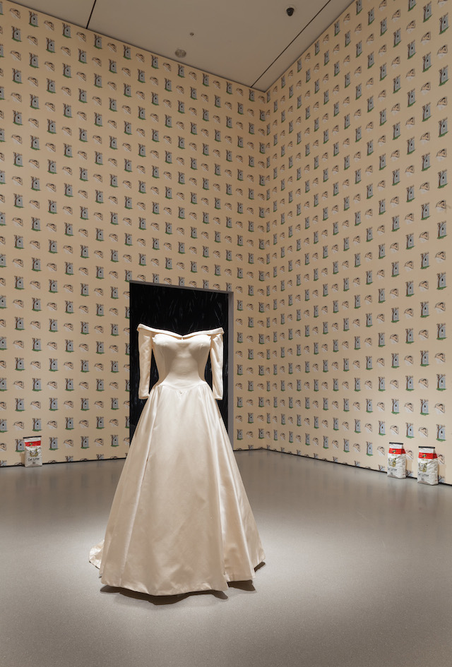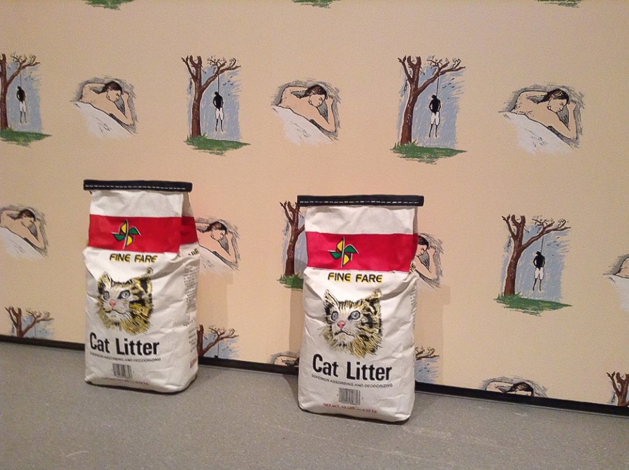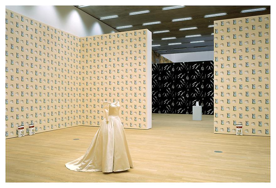 En el centro de la instalación colocó un vestido de novia, rígido y vacío, sostenido por una armadura de acero soldado. Alrededor de la sala, apoyadas en las paredes, dispuso ocho bolsas de yeso pintadas a mano con arena para gatos, elementos aparentemente discordantes y caprichosos. La arena para gatos, un material que absorbe y oculta los desechos, funciona como remedio simbólico para el desorden figurativo representado por la novia, el novio y el hombre negro asesinado.