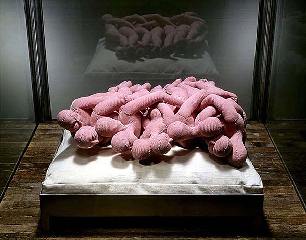 La primera vez que vi esta obra imaginé una cama en un viejo camión y la asocié formalmente con la pieza de Louise Bourgeois «Seven in bed«, pero aquí de modo antitético lo amoroso y divertido es convertido en escombro rosa.