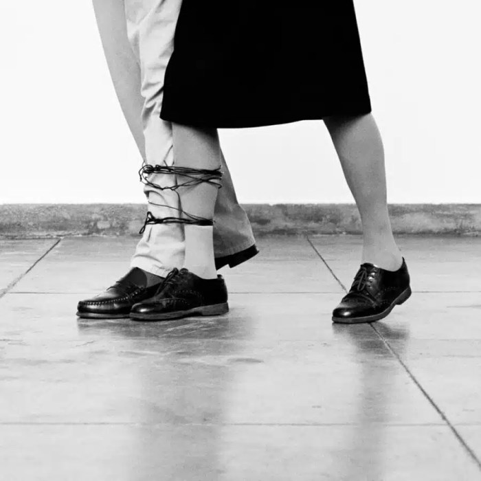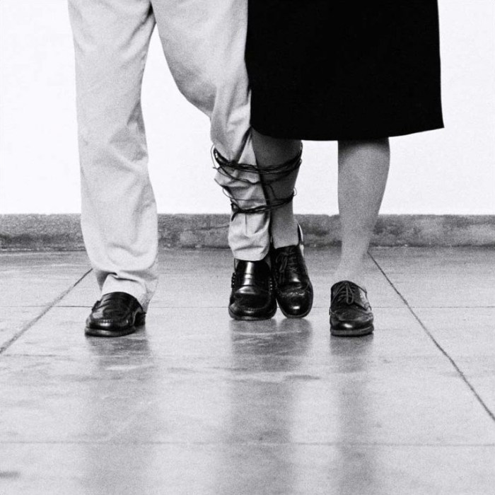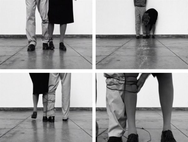 “No son autorretratos porque no encuentro en ellos mi subjetividad, sino mi plural al que hago asistir a una especie de escena.»— dice la autora. Ese nosotros se refiere a las obras que incluyen también a Artur Rosa, su marido. En Sin título, ambos aparecen con las piernas atadas, caminando con dificultad. Es una imagen íntima que muestra la complejidad de una relación que continúa más allá del cuerpo.