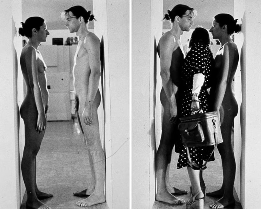 Marina Abramovic & Ulay se sitúan desnudos, uno frente al otro, en un marco de puerta estrechísimo por el que el público tenía que pasar obligatoriamente al museo. Un gesto poético en el que los artistas se convertirían literalmente en la puerta del museo. Para avanzar, la gente debía rozar sus cuerpos y decidir, casi sin pensarlo, de qué lado hacerlo. Suponía una mezcla de incomodidad, curiosidad y vulnerabilidad, tanto para los artistas como para quienes se enfrentaban a ese “pasillo humano”.