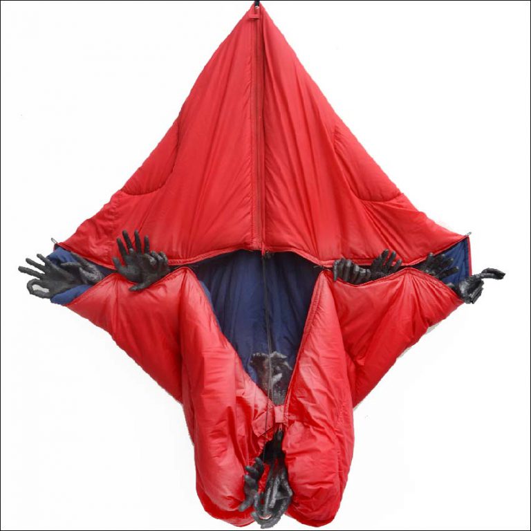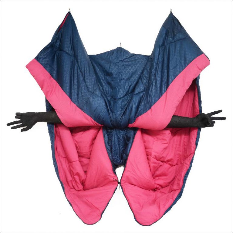 En cada pieza aparecen manos negras en material acrílico que salen de los textiles, como si las esculturas cobraran vida por un momento. Esto añade un toque inquietante, entre lo vivaz y lo fantasmagórico. Aunque algunas imágenes parecen juguetonas o alegres, las obras siempre mantienen una mezcla ambigua de emociones, oscilando entre lo lúdico y lo sombrío, entre la vida y la muerte.