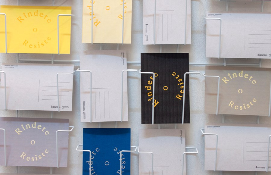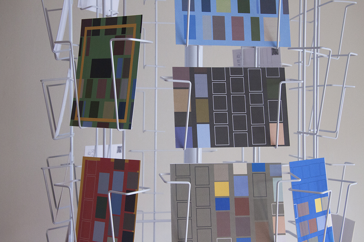 Esta mención a las tarjetas postales me da pie para su uso en el proyecto. Tomo como punto de partida una idea que contradice la propia esencia de las tarjetas postales. Si sirven para divulgar imágenes asociadas a lo tópico, al lugar como objeto de consumo bajo una mirada superficial, en mis tarjetas he eliminado toda figuración. Me he servido de la idea de captura de pantalla de una búsqueda del pueblo de Vidángoz en Google, extraída previo a la carga de las imágenes (justo en esos segundos de tiempo que tarda el ordenador en cargar imágenes o simplemente en una navegación con las imágenes bloqueadas). “Antitarjetas postales” en las que se excluye (desaparición, pérdida) cualquier elemento figurativo, ya sea paisaje o vistas del pueblo, que pretenden ser invitación a que el grupo de Vidángoz aporte imágenes propias desde su propia subjetividad, una invitación a tener una mirada propia.
