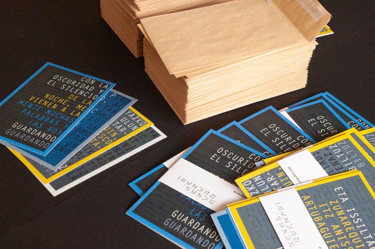Ilusionada porque han sido los vecinos quienes me han pedido que la memoria de Landarte permanezca en el pueblo. Han gustado mucho las tarjetas postales con la frase de Mendigatxa en castellano y uskara roncalés. Les sugiero una versión de las tarjetas en formato cartel, para los cuales habría que decidir una ubicación. Me piden que sea sobre material antivandálico, está muy reciente el boicot y las pintadas sobre los carteles de las rutas BTT instalados en la entrada del pueblo. Hemos hablado también de la edición de tarjetas postales y su envío a todos los vecinos de Vidángoz.