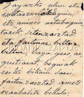 «Gayazko ulun eta issiltarzunarequin, itz anissco artubaguietarik sitenzaitad; eta faitenaz, biltuz, biltuz; baya gero, arguitiarat, beguiak iriki bikain sarri faiten zaiztad amets izanbalitz bikala.»